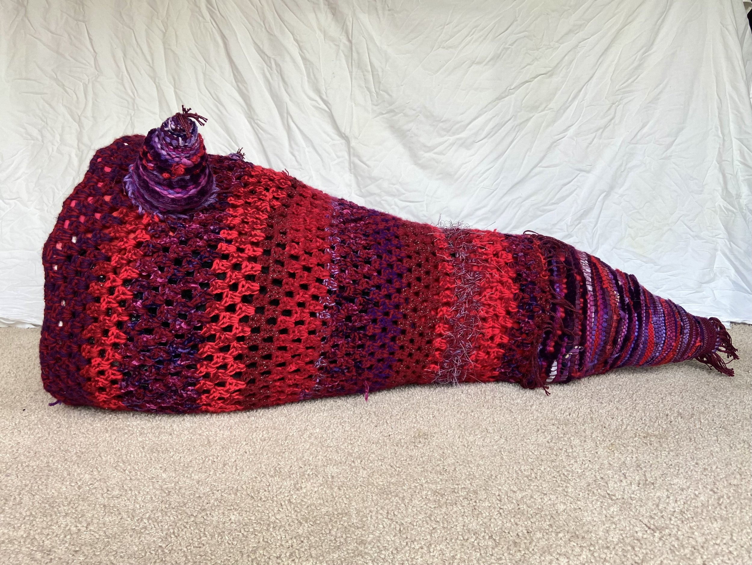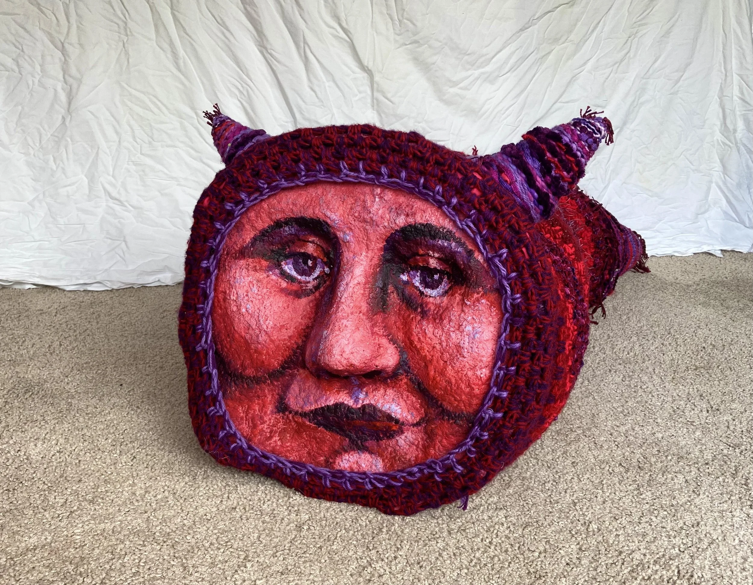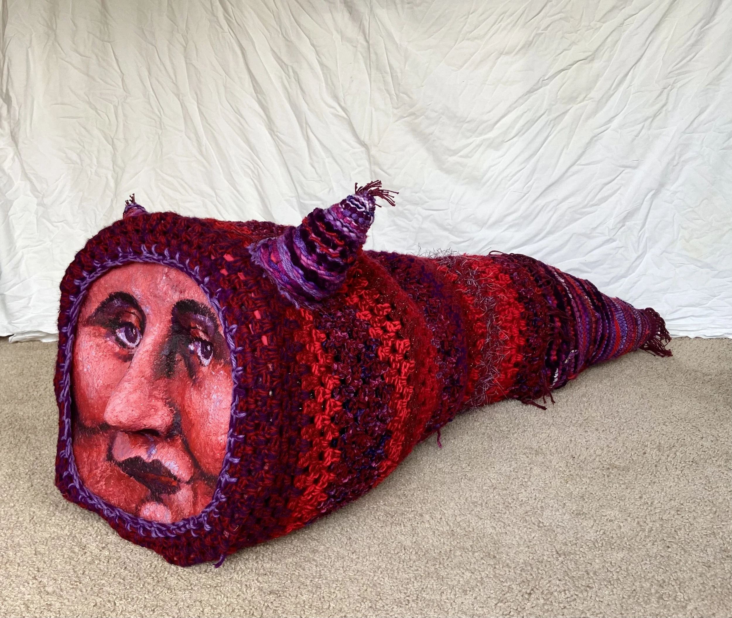 One creature that finds shelter in "Whispers from the Patchwork Refuge". The cone shaped tail and horns were woven on a cone loom I built and the body was crocheted. The face was painted to loosely resemble one of the friends I grew up with.